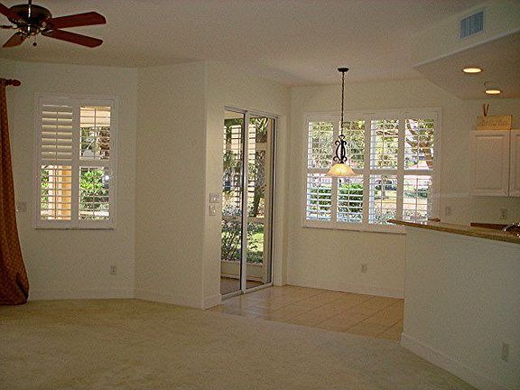 This 2BR/2BA + Den Tobago Model Coach Home features an open floor plan with 2 car attached garage, electric hurricane shutters, granite counters, raised panel cabinetry, custom mural accents and plantation shutters! Lush rear vegetation plus tranquil side yard views that feature mature landscaping with lagoon and footbridge to the resort style pool as the backdrop!
