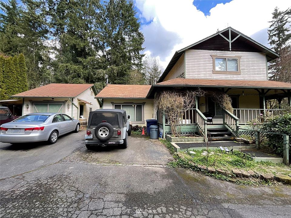 This home sits on a large fully fenced 15,246 sqft lot. Enter past the fully covered porch with Japanese maples and flag pole into a cute living room with fireplace on one side and large family room on the other. Kitchen with eating space has french doors leading to deck and back yard. Don't miss the built in mini bar/nook. Lots of natural light. Upstairs has 3 good sized bedrooms and shared full bath with separate door into primary bedroom. Detached garage has loft and room in back for additional work space. RV parking off of driveway. Chicken coop. Desirable location with highly rated Edmonds School District with Bellevue, downtown Seattle and the water all within 30 minutes.