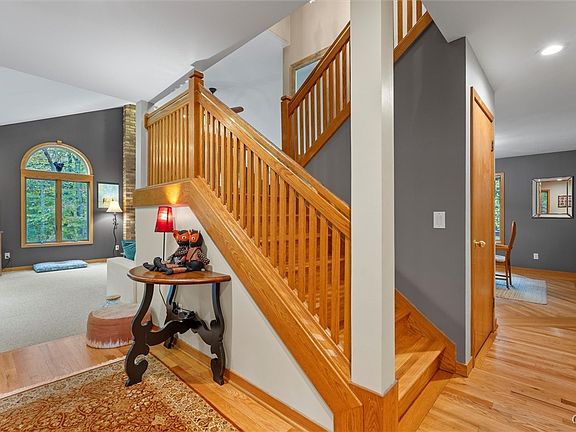 Tucked away on 4.66 wooded acres, this stunning residence blends privacy, natural beauty, and modern updates. Step inside to find gleaming hardwood floors and a dramatic vaulted-ceiling living room filled with natural light. The first floor offers a formal dining room, a beautifully renovated kitchen with a large island, a home office just off the kitchen, first-floor laundry, and a convenient powder room. Sliding doors lead to a spacious deck that spans the kitchen and living room—perfect for hosting gatherings or relaxing while overlooking the private grounds. Upstairs, you’ll find two generously sized bedrooms with a full bathroom featuring double sinks, plus a primary suite retreat with soaring ceilings, an updated ensuite bath, a large walk-in closet with a California Closet system, and its own private deck. The almost 1,000sf walk-out lower level expands your living options with a cozy family area, a second kitchenette, laundry, a full bathroom, and a bedroom—ideal for guests, extended family, or in-law potential. Outdoor living shines here with expansive entertaining spaces surrounded by mature trees. The property also boasts a two-car attached garage plus an additional two-car heated detached garage with office space—offering plenty of room for vehicles, hobbies, or a workshop. If you’re looking for a serene wooded setting with versatile living space and thoughtful updates, this home is a must-see.