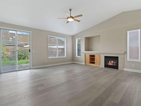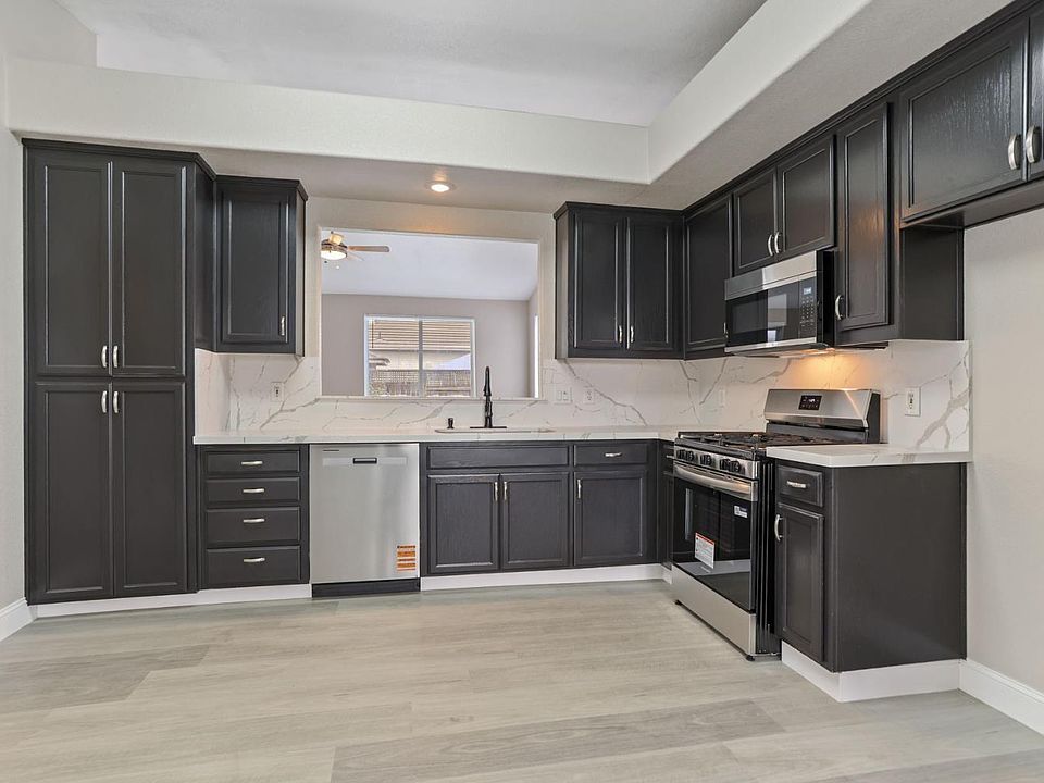 Gorgeous 3-bedroom, 2-bath 9-12+ foot ceilings. Nestled in a quiet, friendly sought-after Morada Ranch community in North Stockton! Quartz counters, new kitchen cabinets, instant gas fireplace, vinyl plank flooring, possible RV-parking. easy access to Hwy 99. The wonderful floor plan is filled with natural light, and the spacious living areas create a warm and inviting atmosphere. Generously sized bedrooms offer comfort and privacy. Leased solar system, low monthly payment. Low maintenance backyard with various fruit trees, persimmon, plum, apple, orange & loquat. Newer AC, heating system & water heater. Location, location! You'll be within walking distance of popular shopping including Walmart, Lowe's, Home Depot, and various restaurants, with Costco nearby.