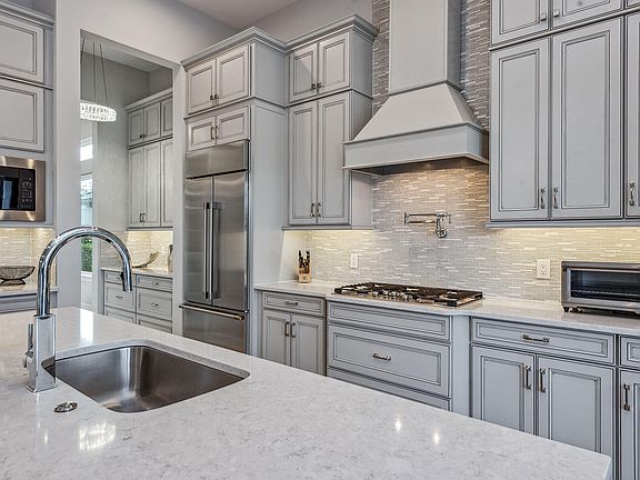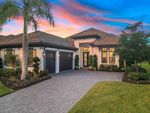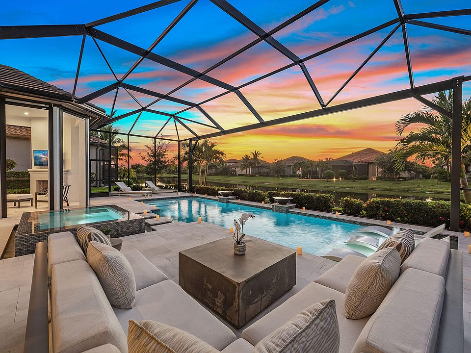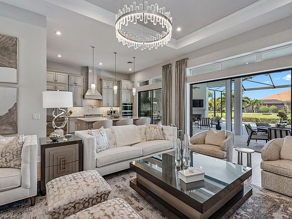 This stunning modern single-family home, showcasing the sought-after Lincoln floor plan, is better than new and offered turnkey with exquisite decorator furnishings, featured in TV commercials for the award-winning designer. Built in 2021, this fantastic 3 BD plus study, 3.5 bath home with 3-car garage showcases spectacular lakefront sunsets and includes all features on a buyer's dream checklist, and it captures serene western lake views and luxurious living in the highly-desired Oyster Harbor neighborhood in Fiddler's Creek. The open-concept design is filled with natural light from expansive windows, a double glass-door entry, and elegant custom lighting. Volume and tray ceilings enhance the sense of space, while rich hardwood floors underscore the home's contemporary aesthetic. The gourmet kitchen is a showpiece with upgraded shaker cabinetry, quartz countertops, mosaic tile backsplash, under-cabinet lighting, a walk-in pantry, and a large center island with breakfast bar seating. Stainless steel appliances include a wall oven, wine cooler, and five-burner natural gas cooktop with hood and pot filler. A living room wet bar with beverage refrigerator and wine cooler makes entertaining seamless. The private owner's suite is a retreat with bay windows, custom drapery, dual walk-in closets with built-ins, and a spa-like bath featuring a dual vanity with makeup counter, frameless walk-in shower with multiple rainfall showerheads, and floor-to-ceiling tile. Two spacious guest suites each offer en-suite baths with quartz vanities and frameless walk-in showers. A French-door den provides the ideal office or study, while the laundry room includes custom cabinetry, sink, and GE front-load appliances. The lanai is designed as an outdoor sanctuary with a heated pool, spa, and sundeck accented by glass water bowls, all set against a travertine deck and panoramic screen enclosure for uninterrupted lake and sunset views. A covered living area with a fireplace, mounted TV, and seating transitions seamlessly to the outdoor kitchen with bar seating, grill and hood, refrigerator, icemaker, sink, and a dramatic mosaic backsplash extending to the ceiling. Additional highlights include a Generac generator, surround sound system, reverse osmosis filtration, tankless water heater, and storm protection with shutters and motorized screens. Residents enjoy world-class amenities including a fitness center with trainers and classes, active tennis and pickleball, bocce, resort-style pool with waterfalls and slides, spa services, casual and fine dining, and a vibrant social calendar. Miles of sidewalks for walking, running of bicycling. Optional golf memberships are available with no wait at the recently renovated championship course and impressive brand-new clubhouse, along with optional beach and marina memberships for the ultimate Southwest Florida lifestyle. Convenient to beaches, parks, yacht clubs, boutiques, grocery stores, executive airport and all area amenities.