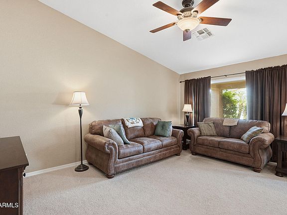 Welcome to this Retreat model in Solera Chandler, a premier 55+ community known for its vibrant lifestyle and amenities including pickleball, tennis, workout facilities, heated pools, spa, and countless clubs and activities. This turnkey, fully furnished home features a spacious front patio and a covered back patio—perfect for morning coffee or sunset relaxation. The kitchen offers striking black granite countertops, white cabinets, and an eat-in dining area that opens to the bright great room. The thoughtful split floor plan provides privacy for guests, while the backyard is framed by a short privacy wall providing the right amount of openness. Inside laundry completes the convenience. Move-in ready—just bring your clothes and enjoy!