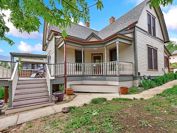 Fenced for privacy, a beautiful front porch awaits with a serene mountain view. The interior has the charm of times past with nice updates. The main level had a family room with a walkout to the front deck. Formal dining room, kitchen with breakfast bar and pantry, and walkout to the backyard. A bedroom and a 3/4 bath are also on the main level. The windows throughout the home have been updated. Upstairs, you will find the primary bedroom, two additional bedrooms, and a full bath. The upstairs bedroom doors are adorned with stained glass windows. Tons of lot space with a pond and gazebo. This home features alley access with parking and a large workshop equipped with electricity.