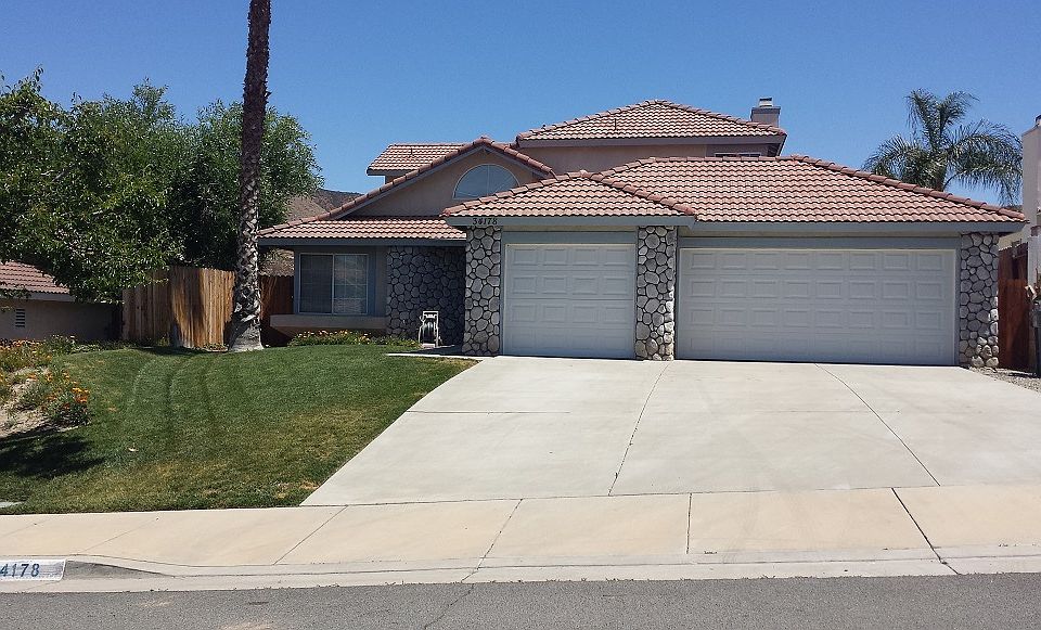 This great 4 bedroom house in Wildomar has one bedroom downstairs and 3 upstairs. The window coverings are being completely redone with custom blinds. The large kitchen opens up to the family room with fireplace and looks out to the cute backyard. The gardener is included in the rent. Additional $400 Pet Deposit if pet approved by owner.