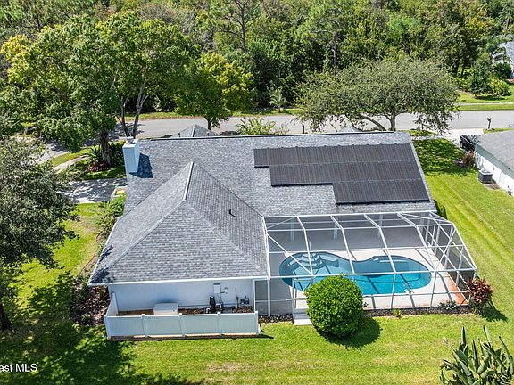 Welcome to your stunning 4-bedroom lakefront pool home located in the desirable Greystone community. Positioned on a corner lot within a quiet cul-de-sac street, this move-in ready residence offers exceptional upgrades and energy-efficient features such as Whole-house solar system and Generac generator for reliable, eco-friendly power, Impact-rated Eco windows and roll down electric Kevlar hurricane blinds on the screened-in porch, 2025 repainted pool deck with no-slip and no-heat feature, HVAC replaced December 2024, and 8-year-old roof with gutters and leaf filters. The kitchen is updated with granite countertops, maple cabinetry, and it open to the family room. Bathrooms have been remodeled recently and the primary bath features non-slip tile, handicap-accessible walk-in shower, dual vanities with granite countertops, and soft-close cabinets. Your primary bedroom comes with 2 walk-in closets with custom organizers. Family room has a wood burning fireplace and vaulted ceilings. The community is super close to KingCenter, Publix, dining, shopping, parks, the beaches of Brevard County, and easy access to I95 for weekend trips to Orlando and Disney. This home combines comfort, safety, and styleperfect for buyers seeking quality and convenience.