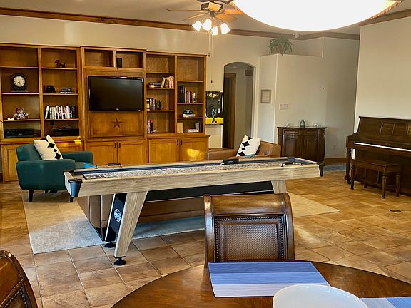 Poolside basketball hoopPool and heated jacuzziAssorted pool floatsLeather sofa and chairsJetted jacuzzi tubUpright pianoLighted dart board cabinet