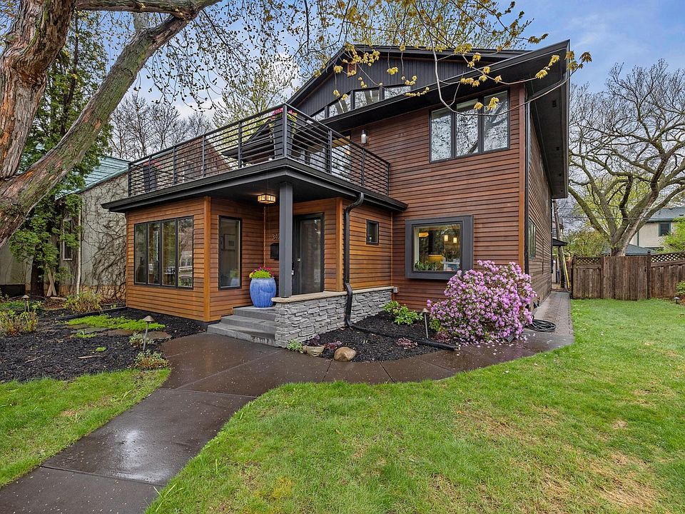 Beautifully updated 2-story with ample views of the wilderness park across the street. Just steps to the Mississippi River, this architect-remodeled treasure has an enormous owner's suite with vaulted ceilings and french doors leading to a spacious front deck and large transom (peak) windows. The home is encased in timeless cedar siding. With the side upper deck and the two lower patios, outdoor living at home is realized. The main level is an open concept delight with gleaming oak floors and built-in Cherry wood book shelves and fireplace mantle. The dark granite kitchen island creates a wondrous contrast to the cherry wood cabinets and doors. The finished basement rec room offers a quiet get away for reading, TV, or music. Run, walk, or bike along the river trails and the Grand Rounds enjoy the Minnehaha Falls and nearby trails. The sense of quiet privacy is capped by the low-traffic road, the city park, and the dead-end alley. Enjoy every season.