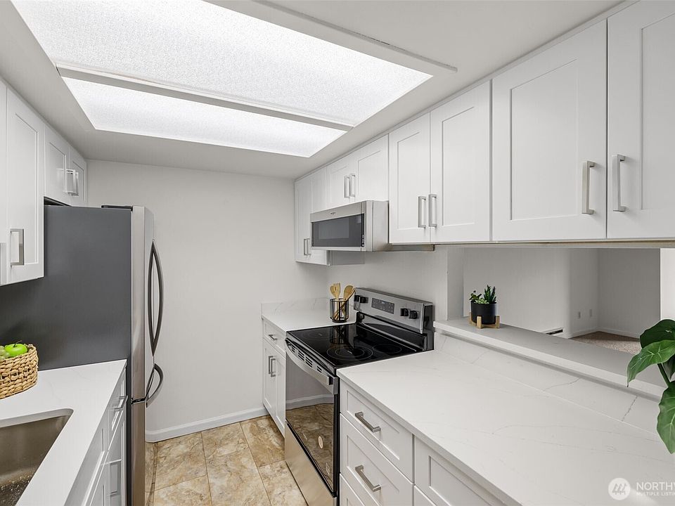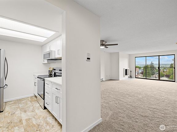 Best Deal in Town! Move-in ready & fully remodeled, this stunning 1 bed/1 bath condo is nestled in the heart of Everett! Enjoy peaceful eastern views of the Cascade Mountains—away from the street side. Inside, you'll find new stainless steel appliances, quartz countertops, sleek cabinetry, fresh paint, plush carpet, and a new hot water heater. The oversized walk-in closet is perfect for custom built-ins. A spacious laundry room offers extra storage, and the private balcony is ideal for relaxing or growing a container garden. The secure building includes one dedicated parking spot, 3 x 7' storage locker, and a community lounge. HOA covers water, sewer, and garbage. Conveniently close to transit, downtown shops, and restaurants.