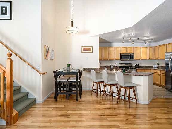 Upon entering through the front door, this condo immediately opens up into the center of the home, where you will find the living room and kitchen. The living room is the perfect place to relax with comfortable furniture, a large TV, and a gas fireplace. Directly outside the living room is the private patio with a gas grill and stunning views of Mt. Werner. The spacious kitchen is remodeled with granite countertops, stainless steel appliances, and modern lighting. There is seating for 7, with 4 at the high-top table and an additional 3 at the kitchen bar.