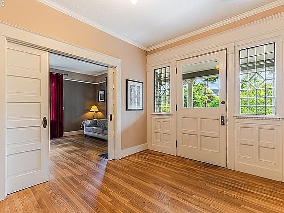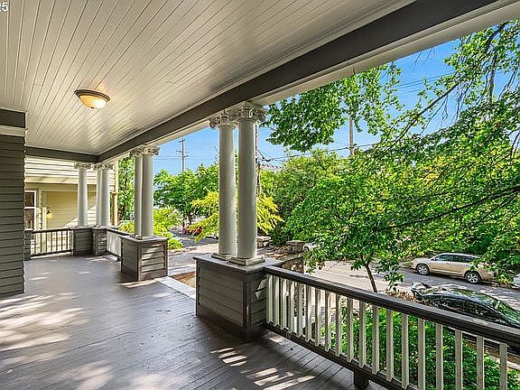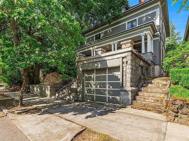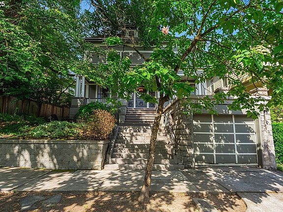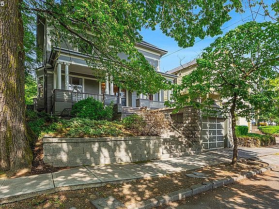 Beautifully updated and meticulously cared for over the years! Greek revival columns, dentil exterior moldings, huge front porch, rare attached garage, inset stainless steel gutters, plus oversized yard. 10 foot ceilings throughout main floor and 9 ft upstairs. Gorgeous gleaming oak and hardwood floors throughout. Wainscoting, picture rails, oversized windows for incredible light. Stunning art-deco fixtures. Completely redesigned kitchen with updated cabinets, quartz counters, fir floors, island, eating bar, double Dacor ovens, pot-filler, Viking gas range with warming drawer. Gorgeous bathroom remodels with tile floors, clawfoot tub, tiled walls, circular window. Living room with original pocket doors, wood burning fireplace, built-ins, and crown molding. Added suite bathroom with roped marble floor, marble shower, double sinks. Multiple storage rooms and walk-in closets. Updated exterior paint, updated roof, furnace and hot water heater. Cityscape views and incredible yard! Walk to restaurants, OSHU, light rail, shopping and more!