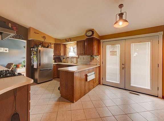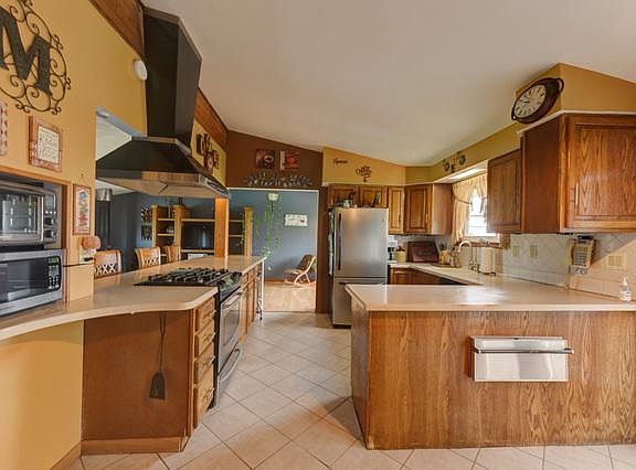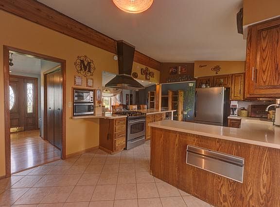 This 3 Bdr. 2 full Bath Tri-level on 5 Acres features an Ceramic tiled, OAK CABINET KITCHEN w/STAINLESS APPLIANCES, CANOPY RANGE HOOD, BREAKFAST BAR & Recess lighting which opens up to an L-Shape Living/Dining Room w/VAULTED CEILING, BAY WINDOW, Wood Laminate Floors & a Wood Burning Stove. It has three SPACIOUS BEDROOMS upstairs and the MBDR has an electric corner fireplace. There is a LOWER LEVEL FAMILY ROOM, UTILITY ROOM & a SUB-BASEMENT. All on a BEAUTIFULLY MANICURED 5 Acre parcel with a 2 Car GARAGE, Wood Barn Shed & Chicken Coop and REAR CONCRETE PATIO w/Dog Run.