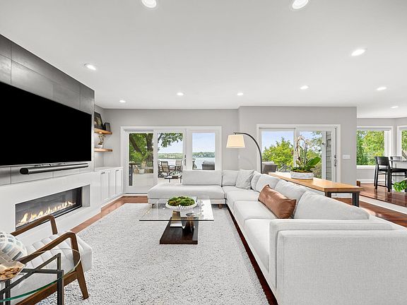 Enjoy a renovation that truly allows you to move in and instantly enjoy it all! A gourmet kitchen dazzles the eye and excites the chef in everyone. Wolf range with pot filler faucet, Bosch appliances, floating shelves, spectacular granite countertops and large walnut prep island with wine fridge. Three bedrooms up including the sumptuous primary suite with private lake side balcony. Deep jetted tub, walk in shower, double sinks & make-up vanity. Lower level spaces include glorious family room with built in cabinetry and gas fireplace; guest bedroom and bath and wonderful storage areas. New Renewal by Anderson windows and Hardy Board siding. Great outdoor spaces on .42-acre lot make for unbelievable entertaining options & privacy. 646 sq. ft of new composite decking run the length of the home providing endless areas for viewing lake activity, entertaining and watching truly glorious sunsets. Stunning westerly LONG views of Cooks Bay are yours from nearly every room in the house. 10/10 views... Enjoy panoramic views while sipping your favorite beverage from the luxury of your hot tub, or from the private owner's suite balcony. Privacy and green space are yours on a nearly half an acre lot. Take the new hill-hiker to 80 feet of glorious lake shore with a hard sandy beach on Lake Minnetonka. This one offers it all. And yes, the heated garage is equipped with an EV charging station.