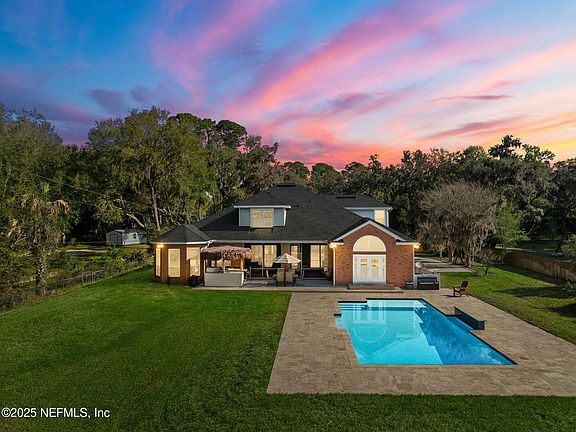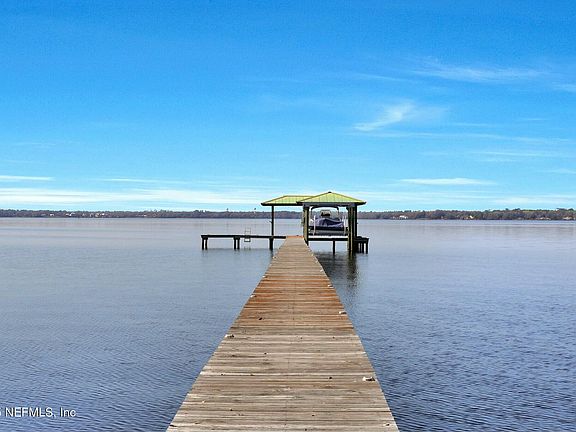 Exquisite 2.16-Acre Riverfront Estate on the St. Johns with Private Dock & Boathouse! Experience breathtaking sunsets and serene water views from almost every room in this custom-built, all-brick 2-story home. Situated on a 2.16-acre lot, this riverfront oasis features a gate with cellular-based keypad, pool and a dock equipped with a covered electric boat lift and jet ski lift. Inside, you'll discover an abundance of luxurious living space, including 6 bedrooms and 4.5 bathrooms. The main floor master suite boasts a sitting area/office nook, a luxurious bath with a walk-in shower, and dual walk-in closets. An additional bedroom with a full bath is also located on the main floor, perfect for a mother-in-law suite. Upstairs, you'll discover four spacious bedrooms, a loft area, and two full baths. The open-concept kitchen and great room boast vaulted ceilings, a cozy fireplace, 42'' maple cabinets, and a walk-in pantry. Additional features include formal living room, butler's pantry, main-floor laundry, attached 3-car garage, and a detached 2.5-car garage/workshop.