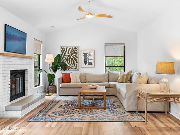 The living room features a vaulted ceiling and a cozy fireplace, creating the perfect atmosphere for both relaxation and hosting friends and family. The kitchen features white soft-close cabinets, a butcher block island and stainless steel appliances. The entire home is adorned in luxury vinyl plank flooring and custom shades in the kitchen, dining and living rooms.