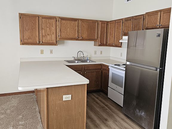 Spacious and inviting 2-bedroom, 1-bath second-floor apartment available for rent. Features an open living room, dining area, and kitchen with cathedral ceilings and a skylight that brings in plenty of natural light. The cozy living room includes an electric fireplace. Both bedrooms are good size, and there's a large utility room with a washer and dryer included. Additional storage shed is also available. Convenient location and move-in ready! Section 8 approved property.
