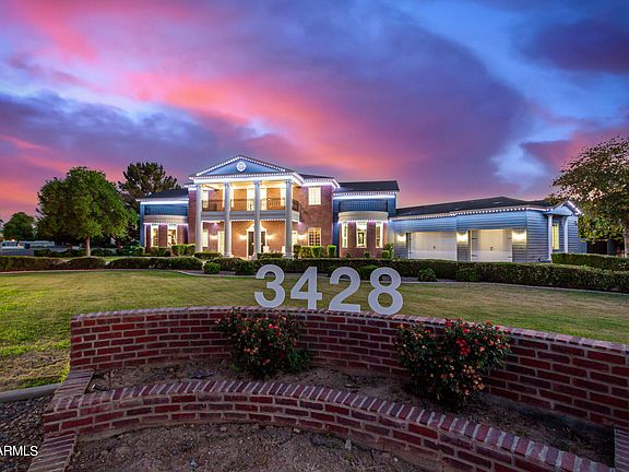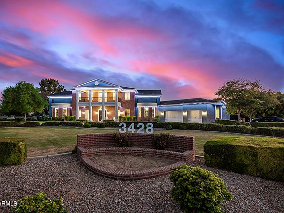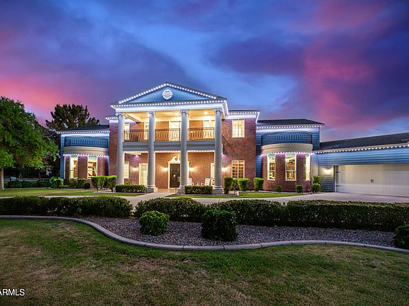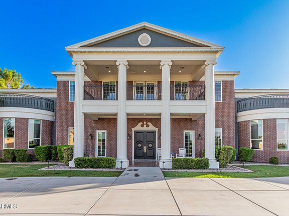 Experience livable luxury in this stunning iconic colonial style home ideally located across the street from the LDS Temple in the heart of Gilbert. The architectural masterpiece combines historic elegance with modern amenities, offering an unmatched lifestyle. Designed for both comfort and entertainment, this nearly 11,000 square foot home features a beautiful front porch and balcony straight out of the movies, grand foyer, 20 ft. vaulted ceilings, extensive molding and trim work, expansive living and dining areas, a huge entertainer's kitchen with hidden walk-in pantry complete with a commercial grade walk-in refrigerator, indoor pro racquetball court, theater room and serene library. Majestic kitchen features a two tier island with breakfast bar and large dining area with the temple as a backdrop out every window. The home boasts 5 spacious bedrooms and 5.5 bathrooms, extended 3 car garage on one side of the house and an additional 2 car garage on the apartment side of the home. Enter the master bedroom through a large sitting room with fireplace and front porch access. Large master has built in bookshelves, bay window with temple views, and large ensuite bathroom complete with his and hers sinks, expansive walk in shower/steamer and walk through master closet. Relax in the upstairs loft, on the balcony or with your favorite movie in the theater. Large laundry room is equipped with 2 sets of washer/dryer, center island surrounded by cabinets and more storage. The separate apartment is perfect for guests, in-laws or rental income. RV gate with RV pad. 32kW paid off solar system with battery backup. With no HOA restrictions, you have the freedom to truly make this home your own. Embrace the perfect blend of historic charm and contemporary luxury in a location that offers top-rated schools, easy access to the 202 freeway, Mercy Hospital, San Tan Mall, dining, entertainment, shopping and community events. Too much to list here, this home is a must see.