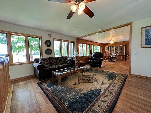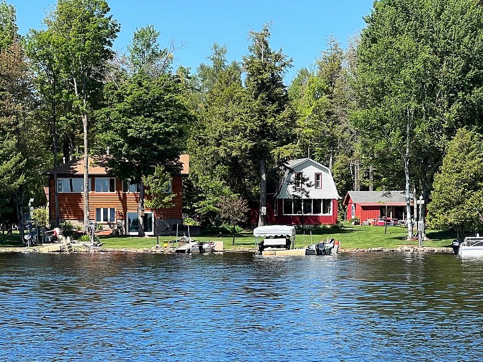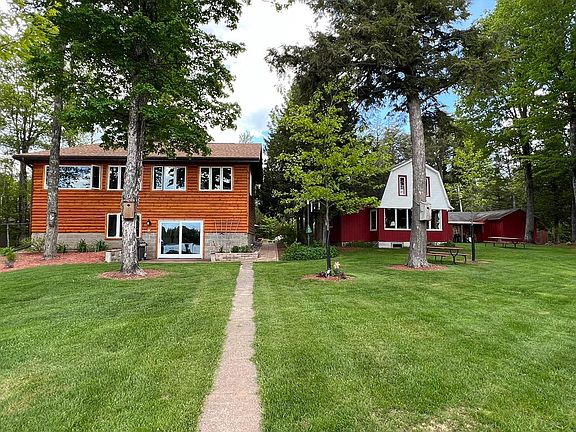 Perfect level sand frontage, facing south on the Turtle Flambeau Flowage featuring the most beautiful, picturesque view of State-owned islands! This complete package includes an extremely well maintained 2-bedroom 2 bath home, plus the cutest seasonal 4-bedroom log-style cabin that is currently managed by a rental company, a 36x24’ log sided garage, a 24x30’ metal pole building and a 34x22’ 1 car garage with a workshop! New 3 bed septic installed approx. 9 years ago, along with new windows and new log siding & attractive stone on the home. Amazing waterfront views, gorgeous rustic hickory cabinets, center island, finished walk out LL, stunning landscaping, large yard for games, firepit and lakeside patio. Come check out all this amazing property has to offer!