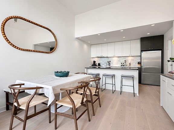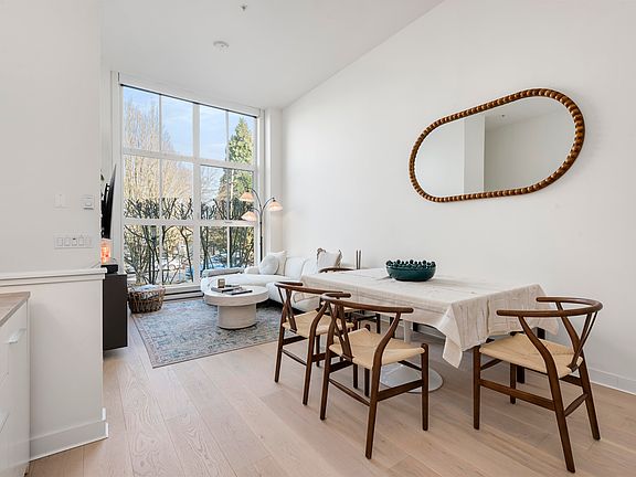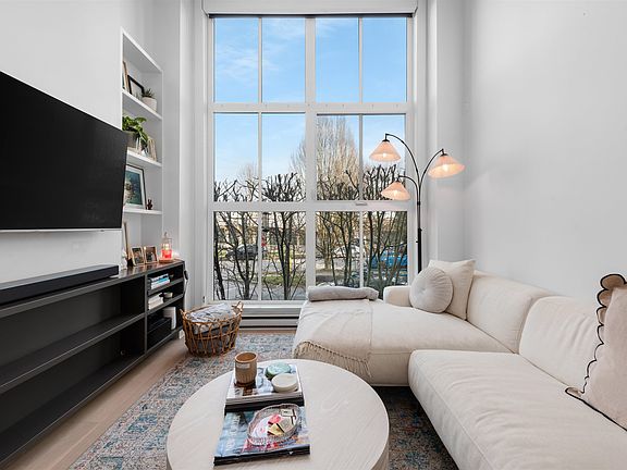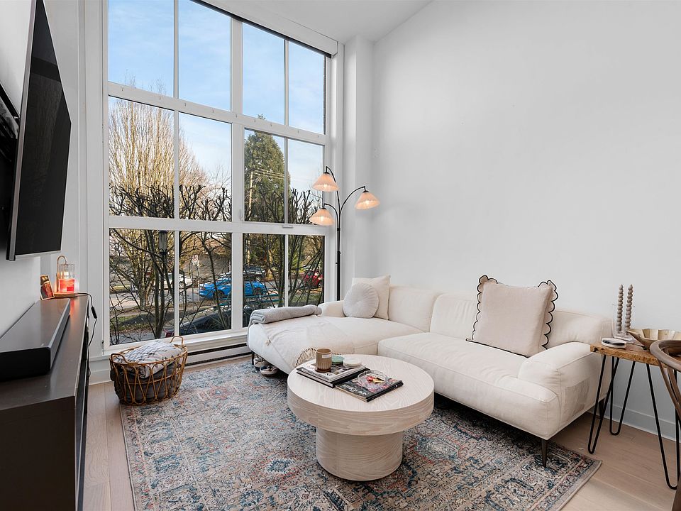 Welcome to Mason by Boffo, a boutique collection of modern townhomes located across from Trout Lake Park. This bright, stylish home features private street entry, soaring 12-foot ceilings, oversized windows, and open-concept living. The sleek kitchen includes quartz counters, marble tile backsplash, matte lacquer cabinets, and premium appliances. Enjoy a sun-soaked west-facing patio off the primary suite and a second bedroom with space for a home office. Updates include new hardwood floors throughout, custom built-in closets, and a new hot water tank. Includes one secure parking stall, storage locker, and bike storage. Steps to Trout Lake, trails, Commercial Drive, and SkyTrain. A must-see!