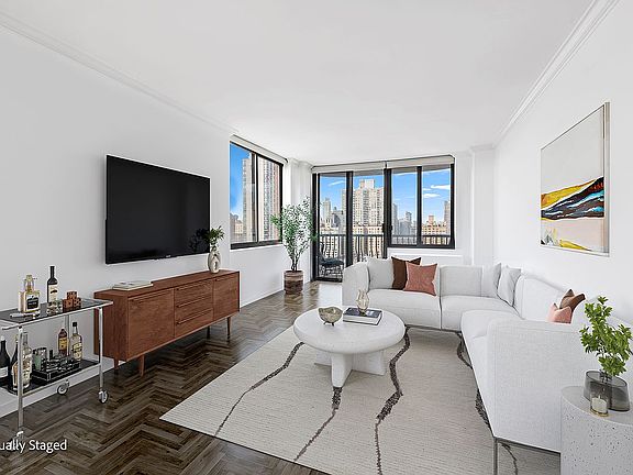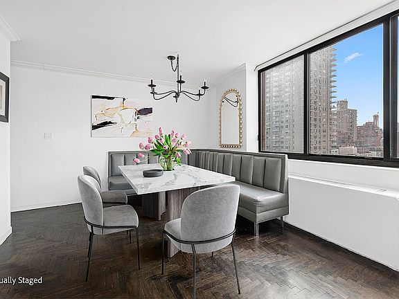 Must see UES Gem in the Sky! Come and tour this stunning 2BD/2BA corner unit with sweeping views of New York city. This home offers a gracious layout with ample space for a designated dining area and built-in banquet seating. The expansive 34-foot living room opens on to a large private terrace and is surrounded by oversized windows. The space enjoys plenty of light throughout the day with unobstructed northwestern views of the city, and a majestic cityscape that twinkles at night.