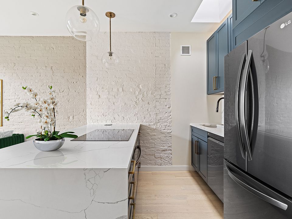 This sun-soaked top floor home offers a seamless open-concept layout, perfect for entertaining or relaxing in elevated style. The custom chef's kitchen is a standout, featuring navy blue hardwood cabinetry, brushed gold hardware, slow-close drawers, and a quartz waterfall island with bar seating. A fired clay farmhouse sink, in-sink disposal, and high-end appliances - including an LG refrigerator with ice maker, Samsung convection oven and dishwasher, and even a built-in glass washer - make this kitchen both functional and striking. A skylight and globe pendant lighting infuse the space with warmth and natural light, and the painted exposed brick adds character against the modern touches.