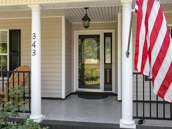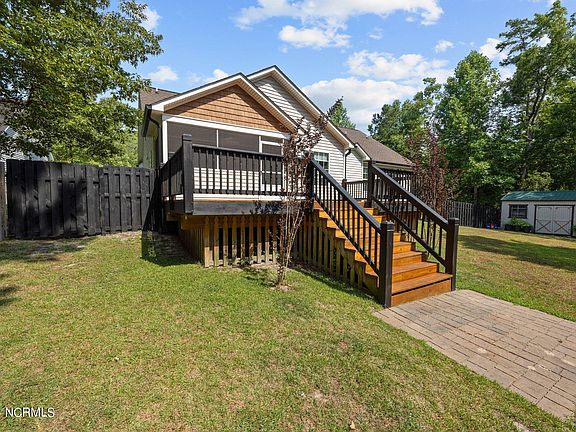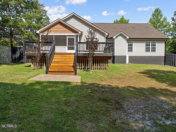 Large 4 bedroom waterfront home on an acre of property with 132' dock offering creek access and amazing peaceful views. As you approach the house, you'll be greeted by a meticulously landscaped yard and a spacious covered porch. Upon entering, you will love the open floor plan, beautiful countertops, LVP and tile flooring, and a split floor plan with Principal Suite on left and two additional bedrooms and a bathroom on the right. Relax in the breakfast nook with views of nature and the water beyond the yard. Upstairs you have a fourth bedroom, 3rd full bathroom and a large bonus room. In the afternoons, you can unwind on the screened back porch, listening to the singing frogs, or head out to your private dock to fish, kayak, or enjoy a nighttime boat ride. Optional HOA $75/yr for use of boat ramp. This home is sure to exceed your expectations!