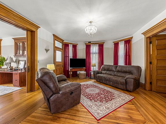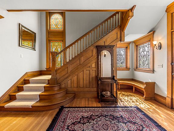 Experience seamless blend of modern conveniences with historic yesteryears craftmanship in this enchanted home. Step into the 2 story entryway and be captivated by the grand staircase that display the lead and stain glass windows. These large light-filled windows highlight the detailed wood trim and high ceilings, creating a warm and inviting atmosphere. To the right of the staircase, you'll find the front room, perfect as a music room, featuring a large picture window and lead glass transom that mirror the ones in the entry. Through the pocket doors, enter the cozy family room with bay windows and the original fireplace facade, now upgraded to remote start with temperature settings for easy use. Adjacent to the family room is a 3- season porch. To the right of the family room, is the spacious formal dinning room that is perfect for gatherings. It leads to the servers hall with swing door and sink. Kitchen hosts stainless steal professional Viking appliances, white maple soft close cabinets, quartz countertops, farm house sink, beverage fridge and butler pantry with built -in cabinetry. Also on the first floor is a large master bedroom, currently being used as a playroom and full bath featuring a charming clawfoot tub with shower. Near the back door, you'll notice a 2nd stair case that leads to the second level, there you will find 3 generously good size bedrooms, some with walk-in closets. A second 3 seasons room perfect for plants or reading area and adjacent to this room is a versatile room for office space, work or lounge space. For added convenience, the second floor houses a laundry area with luxury vinyl, a washer & dryer, above cabinetry, and a sink. But wait, there's more! The third level offers a staircase leading to an expansive unfinished attic, perfect for storage or ready to be transformed into additional living space or play area. Car enthusiasts and hobbyists will appreciate the 3-car garage with a carport and high bay door, complete with a full walk-up second story. There is plenty of room to accommodate a motor home, boat, cars, toys, and tools. This 1896 home also features (1991) concrete deep-poured foundation, updated electric, reverse osmosis system, newer garage roof in 2020, 2023 new white vinyl partial fenced in the front and side yard that offers privacy and outdoor enjoyment. This home is a true gem, meticulously maintained and ready for its new owners to cherish and enjoy. Don't miss the opportunity to make this timeless beauty your own!