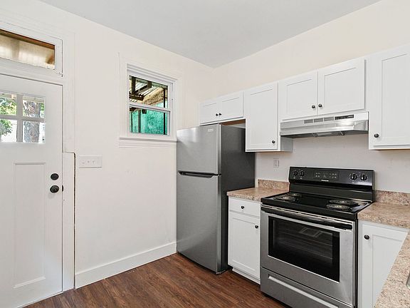 Inside, you'll find LVP flooring, high ceilings, and plenty of natural light throughout the open living and dining area. The kitchen comes equipped with a stove and refrigerator, along with ample space for meal prep and storage.