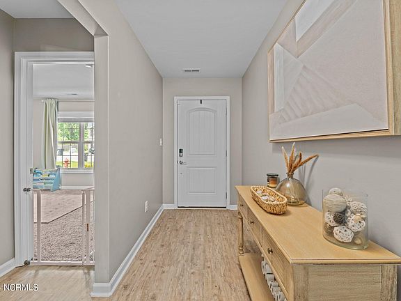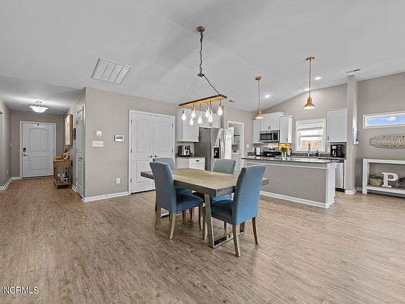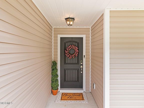 Welcome to this charming 3-bedroom, 2-bathroom home nestled in the sought-after Croatan Crossing neighborhood! As you pull up, you're greeted by a long, paved driveway leading to a 2-car garage and established flower beds. Step onto the covered front porch and enter into a spacious, open-concept layout with vaulted ceilings and luxury vinyl plank flooring that flows seamlessly throughout the main living area and master bedroom. In the living room, a planked accent wall with a custom-built mantle frames a natural gas fireplace, perfect for a cozy evening at home. The kitchen is a chef's dream, boasting beautiful granite countertops, upgraded light fixtures, stainless steel appliances, and a generously sized pantry. Gather around the large kitchen island with bar seating for casual meals or entertaining guests. Retreat to the master bedroom, which features a huge walk-in closet and an en suite bathroom complete with a dual sink vanity, walk-in shower, and separate soaking tub. To the right of the foyer, you'll find two generously sized bedrooms with spacious closets, perfect for family or guests. A full bathroom with a vanity and linen closet conveniently serves these rooms. Grab your coffee and enjoy the outdoors in comfort on your screened-in porch with a ceiling fan overlooking the fenced in backyard. The concrete patio that extends off the porch is perfect for grilling out this summer or relaxing in the sun. NO CITY TAXES! Minutes to MCAS Cherry Point and a short drive to Historic Downtown New Bern and Crystal Coast Beaches.