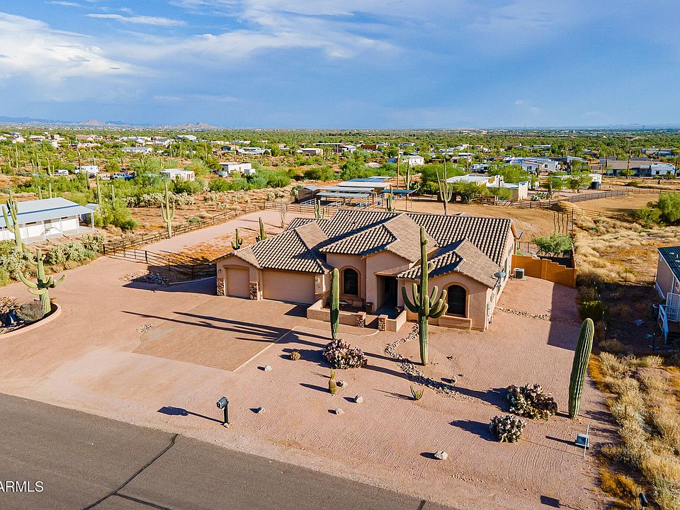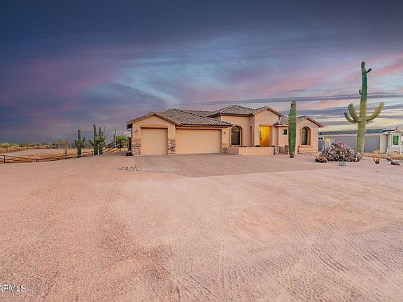 Tucked away in the breathtaking Superstition Mountains, this stunning custom home offers sweeping views of city lights and mountain landscapes. Enter through the courtyard to a mosaic-tiled foyer, where handcrafted wood floors and travertine exude elegance. Expansive windows flood the interior with natural light and frame a picturesque backyard dotted with Saguaros. The cozy den and spacious family room are ideal for both relaxation and entertaining. The chef's kitchen boasts granite countertops, walnut cabinets, and stylish pendant lighting. The luxurious master suite features a custom therapeutic jet tub. This property also accommodates horses with 32x16 horse stalls and nearby riding trails, enhancing its appeal. With new carpet, a 2022 roof, solar panels, 1.25 acres, and no HOA!