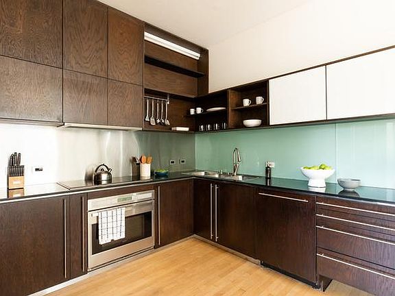 Volume and lightMaple floorsCustom lacquered cabinetryWalls of obscure glassCentral ac