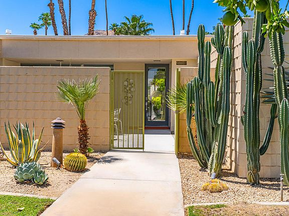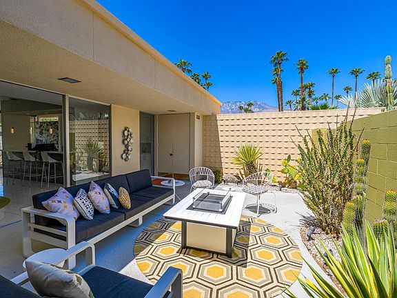 This beautifully remodeled 2bed/2bath home is just waiting for you to call home at the coveted Seven Lakes Country Club. Originally designed by Richard A. Harrison, inside its mod shadow-blocked walls, you'll find a spacious unit updated for today's living. Spread out over the 1,545 sq ft open floor plan, highlighted by light terrazzo tile floors, get ready to entertain in style! The remodeled kitchen is finished with KraftMaid grey cabinetry, sparkling stainless steel appliances, and ample quartz countertops, including a large breakfast bar. Walls of glass sliders open out onto a green leisure terrace with views of the mountains and the iconic Southridge estates. Enclosed for maximum privacy, the northern window wall opens onto a large private courtyard lined with a desertscaped perimeter garden. Both spacious bedrooms offer great closets as well. An assigned two-car garage is available while the tranquil pool is just steps away. The roof has been recently recoated as of July 2025. Past the 24-hour guarded front gate, 'The Gem of the Desert' offers a unique elevated lifestyle with its Ted Robinson-designed 18-hole executive golf course, 15 pools and spas with poolhouses, and the lively William Cody-designed clubhouse with a formal dining room, casual cocktail lounge, and a terrace overlooking the waterfall-fountain. Welcome home!