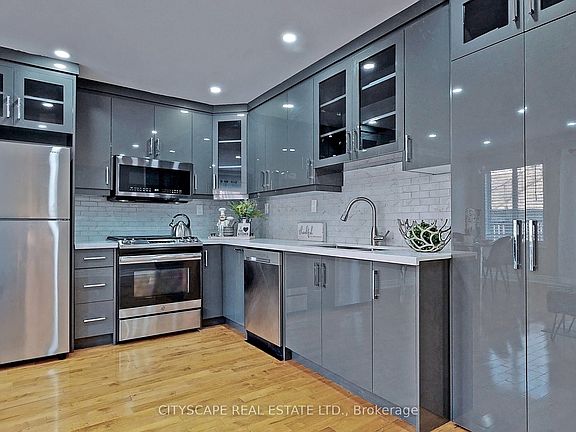 Modern designer kitchenNewer stainless steel appliancesPremium cabinetryPot lightsCrown mouldingIn-unit laundryLarge backyard