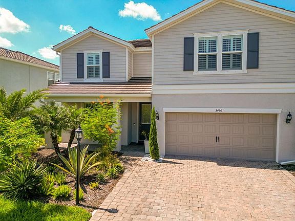 One or more photo(s) has been virtually staged. Exceptional opportunity to own this beautiful, one of a kind, CUSTOM POOL home located in the highly sought-after Mallory Park community in Lakewood Ranch. This stunning residence offers a truly remarkable living experience, featuring over 2800 sq ft, 4 bedrooms and 2.5 bathrooms, a dedicated office, and a versatile second floor bonus room. This Citrus Grove floor plan, built by Divosta, was meticulously crafted with high-end finishes that are sure to impress even the most discerning buyer. The interior of this home is designed for modern living, boasting luxury plank vinyl floors throughout the main level for a clean, contemporary aesthetic, custom plantation shutters, and shiplap accent wall in the great room. The gourmet kitchen is a chef's dream, equipped with top-of-the-line stainless-steel appliances, gas range with stainless-steel range hood, quartz countertops, a large island with breakfast bar seating, upgraded 42-inch upper wood cabinetry with a stylish tile backsplash and a spacious walk-in pantry with shelving. For added convenience and luxury, there's also a built-in wine rack and a KitchenAid beverage refrigerator. Open to the great room, the nearby dining area offers views of the backyard, making this floor plan ideal for everyday living and entertaining. Open the sliders and bring the outdoors in! The spacious first-floor master suite offers a private ensuite bath, complete with dual vanities, a walk-in shower, and a large walk-in closet. The three additional bedrooms are located upstairs along with a spacious bonus room, offering flexible space to suit your lifestyle needs. The outdoor living area is a true oasis, featuring a screened and covered lanai perfect for outdoor living and dining, a custom heated saltwater pool designed by former owners for Olympic training - enjoy morning laps - and luxury Astroturf green space surrounded by lush tropical foliage -- creating perfect outdoor space for relaxation and entertaining. Complete with a spacious laundry room and two-car garage with epoxy finished flooring. Mallory Park is a gated community in Lakewood Ranch that offers an active lifestyle. Residents enjoy maintenance free landscaping, a community pool, clubhouse, fitness center, dog park, playground, a dock for fishing overlooking the large pond, scenic walking trails, pickleball and basketball courts. Conveniently located near parks, sports fields, A-rated schools, SRQ Airport, and University Town Center for shopping and dining.