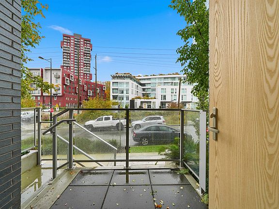 Discover this inviting 1 bed+den home in the heart of the River District, offering rare ground-floor living with private walk-up entrance & patio, perfect for pet owners, cyclists, those who love convenience or evening scenic riverfront walks. Thoughtfully designed with open layout, high ceilings & premium finishes throughout including KitchenAid stainless steel appliances, gas range and quartz countertops. Enjoy year-round comfort with efficient heat pump providing both heating & cooling. With 1 parking stall & 1 oversized storage locker, you have plenty of space in & outside of your unit. Top-notch building amenities including concierge, fitness centra, yoga/TRX studio, rooftop terrace w/ BBQ & lush courtyard. This home checks every box. OPEN HOUSE SAT/SUN NOV 8&9 2-4PM.