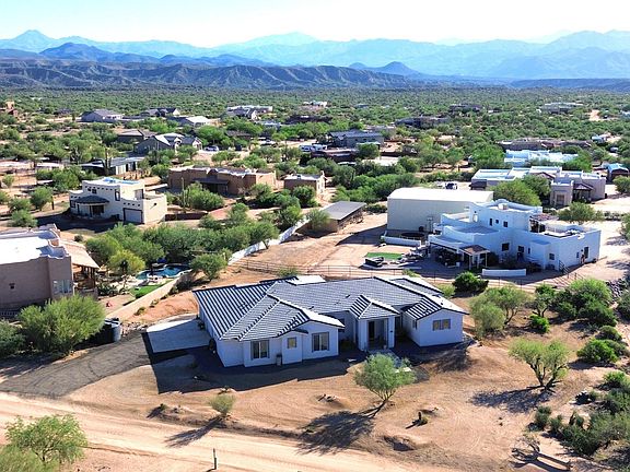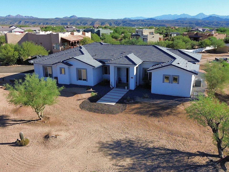 Desert living in this stunning custom home on an acre with breathtaking Four Peaks views. Bright and open with 12' ceilings and abundant natural light. The kitchen features a huge quartz island, porcelain farmhouse sink, custom cabinetry, wall oven/microwave combo, two walk-in pantries, and cozy dining area. 3 bedrooms plus office/den and bonus craft or workout room. The primary suite offers private patio access, dual walk-in closets, freestanding tub, tiled shower, and dual vanities. Energy-efficient with spray foam insulation including in the 3 car extra deep big garage, extra wall batting, and premium Ruud AC units. Relax with spectacular sunsets out front and desert sunrises off your private back patio. EPCOR water membership.
