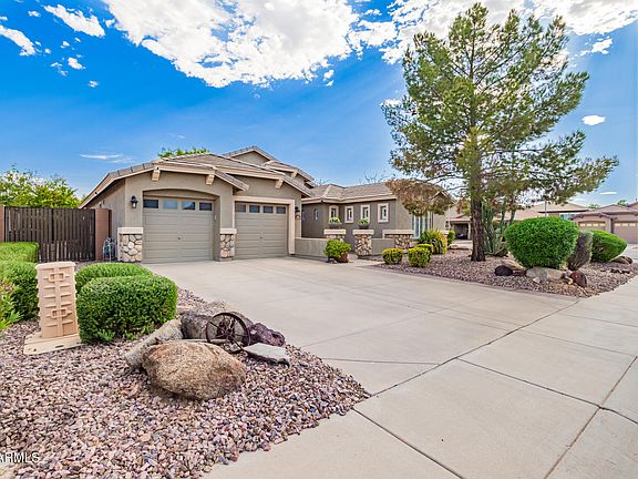 Don't miss the chance to own this stunning single-story home! Everything you need—3 bedrooms, 2 bathrooms, a 2-car garage & RV gates! Inside, you'll find an open floor plan featuring a blend of tile and wood-look flooring, vaulted ceilings, plantation shutters, abundant natural light, and a modern neutral palette. The pristine culinary space boasts staggered cabinetry with crown molding, granite countertops, stainless steel appliances, and an island with a breakfast bar. The serene main retreat has a walk-in closet for easy organization and a spacious bathroom complete with double sinks and a separate shower & tub. The backyard hosts a cozy, covered patio perfect for morning coffee, as well as a lush landscape to complement your peaceful evenings. What's not to love? Make it yours!