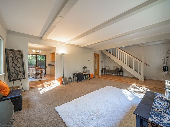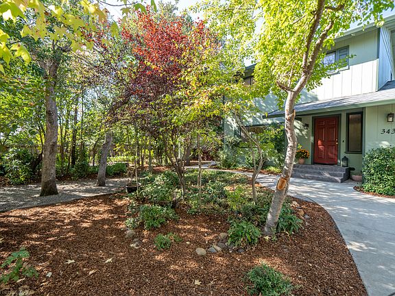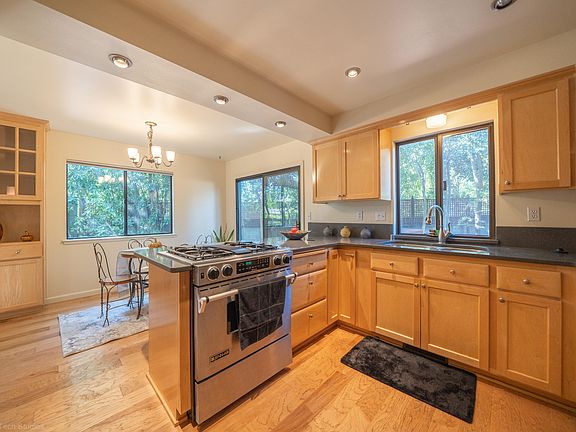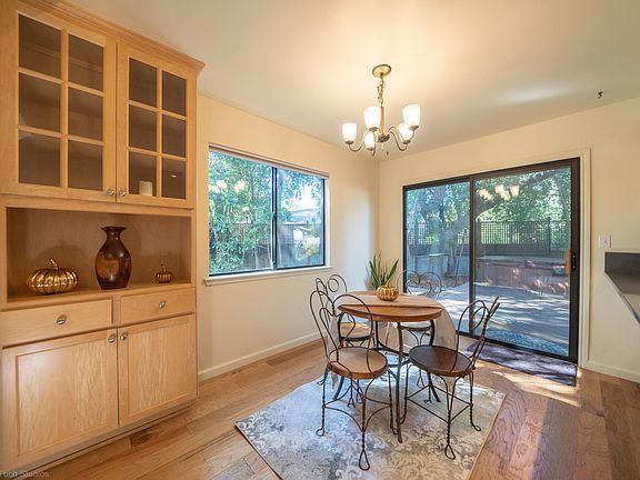Enchanting Forest Hills home on serene 1/3 acre lot. Tranquil yard with numerous inviting patio areas. Updates inside include engineered wood flooring, kitchen cabinetry, granite slab counters & stainless steel appliances. Separate living, family, dining, office & recreation rooms. Half bath downstairs, two full baths upstairs. New roof, skylights, water heater & landscaping. Separate HVAC units for main level & upstairs. Stamped concrete walkways & elevated decks. Hot tub, refrigerator, washer & dryer stay. REU electricity, PGE gas, community water system and new septic leach field. Potential for RV parking. Nearby Clover Creek Preserve provides numerous recreational opportunities. Sun Oaks Racquet Club nearby. Spacious storage shed on slab.