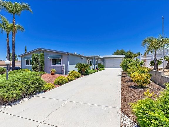 Meticulously cared for home in the friendly active community of The Farm. Lovely cul de sac location with pride of ownership in every home. This large home features newer VINYL WINDOWS, modern window blinds, a BIG KITCHEN with tons of storage and counter space, a long driveway and huge GARAGE/WORKSHOP! Inside the home is super clean! Living space has a cozy fireplace, formal and informal dining areas, and an enclosed sun porch perfect as a den or home office. The primary suite is one of two big bedrooms and full baths situated on opposite sides of the home for privacy. This great floor plan also features a separate built-in computer workspace, indoor laundry and a great open kitchen with rolling island. Outside the house has lush land scape that includes fruit trees, grassy area and flowering shrubs. Outdoor seating is situated near the front door and in a large gazebo type covered patio in the back to take in all the beautiful views this property enjoys. The Farm offers many fun activities and amenities for all ages, including hiking, tennis, fishing, pools, orchards, and a club house and an RV parking area. Conveniently located between the 15 and 215 freeways, close to everything but nestled in the quiet hill side. This home is a gem and won't last long. Please plan to see it today!