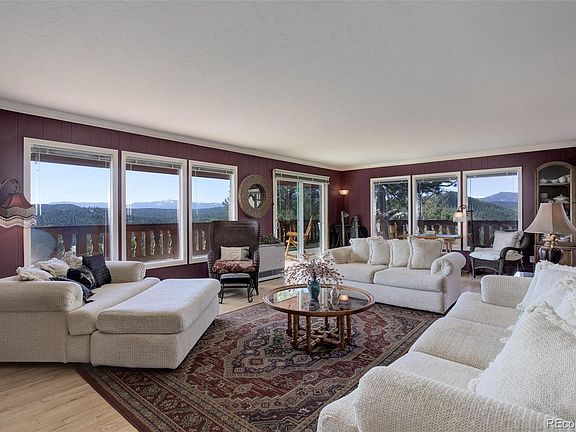 Nestled amidst 5 acres of pines, this beloved 2816 SF home offers mountain living with lots of privacy and awe-inspiring views. The open floorplan has generous living spaces with an expansive living room with 2 walls of large picture windows with panoramas of Pikes Peak, Lion’s Head, Cathedral, and Mt Rosalie. Also on the upper floor is the spacious kitchen, dining room with wall of large picture windows, main floor primary suite, a 2nd bedroom, 2nd bathroom and sunroom. On the lower-level you'll find a family room with walkout access, 3rd bedroom, 3rd bathroom and laundry. Keep it cozy with 3 fireplaces; there is an open wood-burning fireplace in the main floor living room, a wood-burning stand alone stove in the entry, and a wood burning fireplace insert in the lower-level family room. The 5-acre lot is just minutes from the enchanting Staunton State Park and not far from Conifer amenities. The generous wrap-around deck provides expansive space to entertain or just relax while taking in the incredible views and sounds of nature. Ready to create a lifetime of memories? Your mountain dreams await!