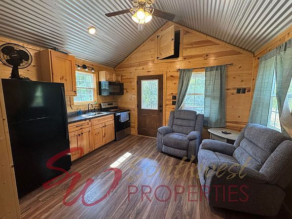 The cabin comes fully furnished with everything you need to feel right at home. It features a cozy living space, a comfortable sleeping area, and a kitchen equipped with a microwave, stove, and refrigerator.