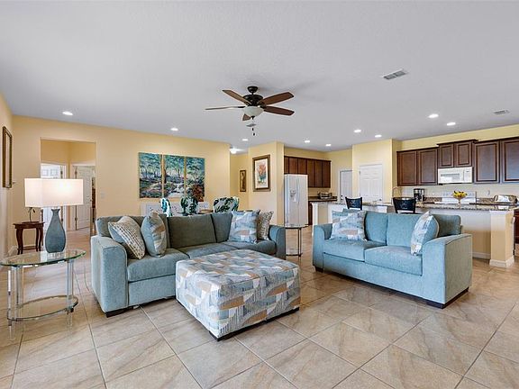 Welcome to this spacious 4-bedroom, 3-bath home offering over 3,133 sq. ft. of thoughtfully designed living space. With a versatile tri-split floor plan, this property is ideal for standard or multi-generational living or an in-law setup. Inside, you’ll find a bright and open layout featuring a gourmet kitchen with granite countertops, an oversized island perfect for entertaining, and a seamless flow into the great room. A formal dining room, large office/den with French doors, rounds out the main living areas, creating the perfect blend of comfort and function. The primary ensuite is a true retreat with dual sinks, a soaking tub, a large walk-in shower, and an oversized closet. Three additional bedrooms—two with cozy carpet and the rest with upgraded tile throughout—offer plenty of flexibility for family and guests. This home has lots of upgrades and extras such as: slide-out shelves in kitchen cabinets, 42" cabinets, laundry tub in laundry, Coreform Insulation and Radiant barrier for energy efficiency, brick pavered driveway, and more. Enjoy Florida living outdoors with a spacious screened lanai and a fenced backyard with no rear neighbors—with ample space to add a pool. The 2.5-car garage provides extra storage or a hobby/work area. Located in the gated community of Spring Ridge Estates, you’ll be close to restaurants, shopping, hospitals, and more, making this the perfect place to call home. *Aerial photo property lines are an estimate and to be verified by buyer.