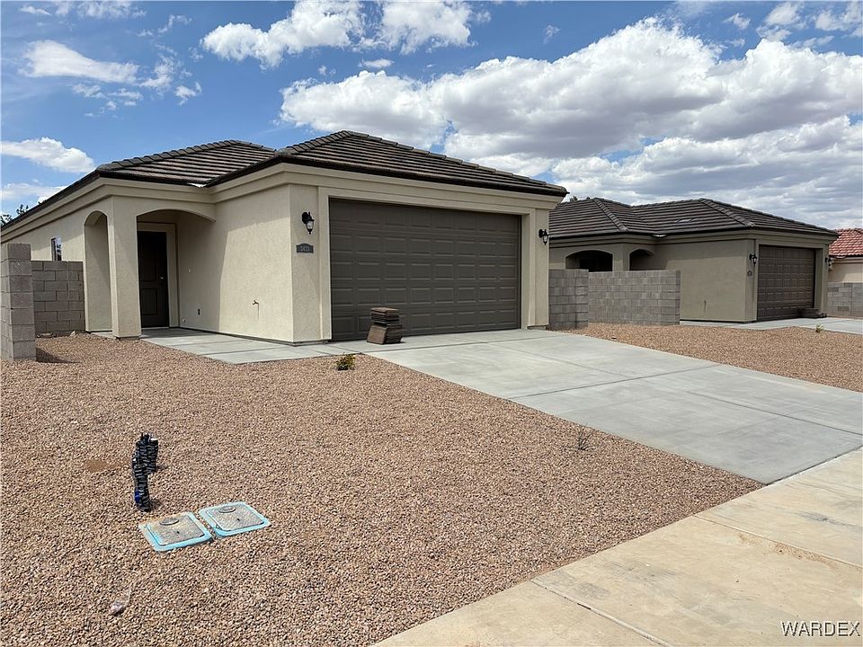 Construction is completed, the house is move-in ready. Model of 1175 square foot new 2x6 construction home with synthetic stucco and tile roof with double-pane windows. The front yard AND the backyard are fully landscaped and has an RV gate access to the back for storing your travel home, boat... The home is set up with electric heating system, range, water-heater and electric cooling system that will keep you comfortable all year around. The 3 bedrooms 2 bathrooms 2 car garage is perfect in the inside, the kitchen has granite counter tops and stainless steel stove, microwave and dishwasher. The open floor plan is perfect for entertaining guests and the vaulted ceilings create a wonderful open space. The home is accented with nickel fixtures in both lighting and plumbing. Tile is placed through the entire house for a more elegant look, walk- in shower in master bathroom, walk-in closet in master bedroom and in the second guest bedroom. 2 year Builder Warranty.