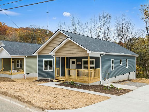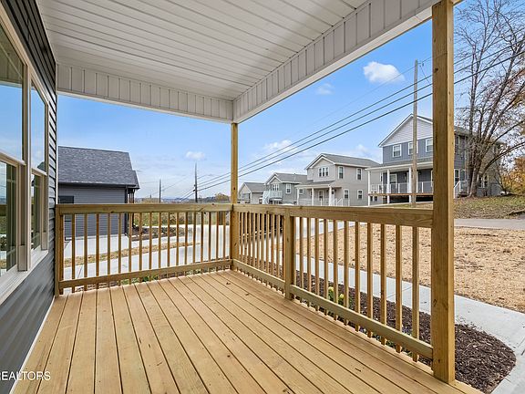 Walk-in closetLarge islandWalk-in pantryCovered porchesNavy vinyl sidingDistant smoky mountain viewsOpen floor plan