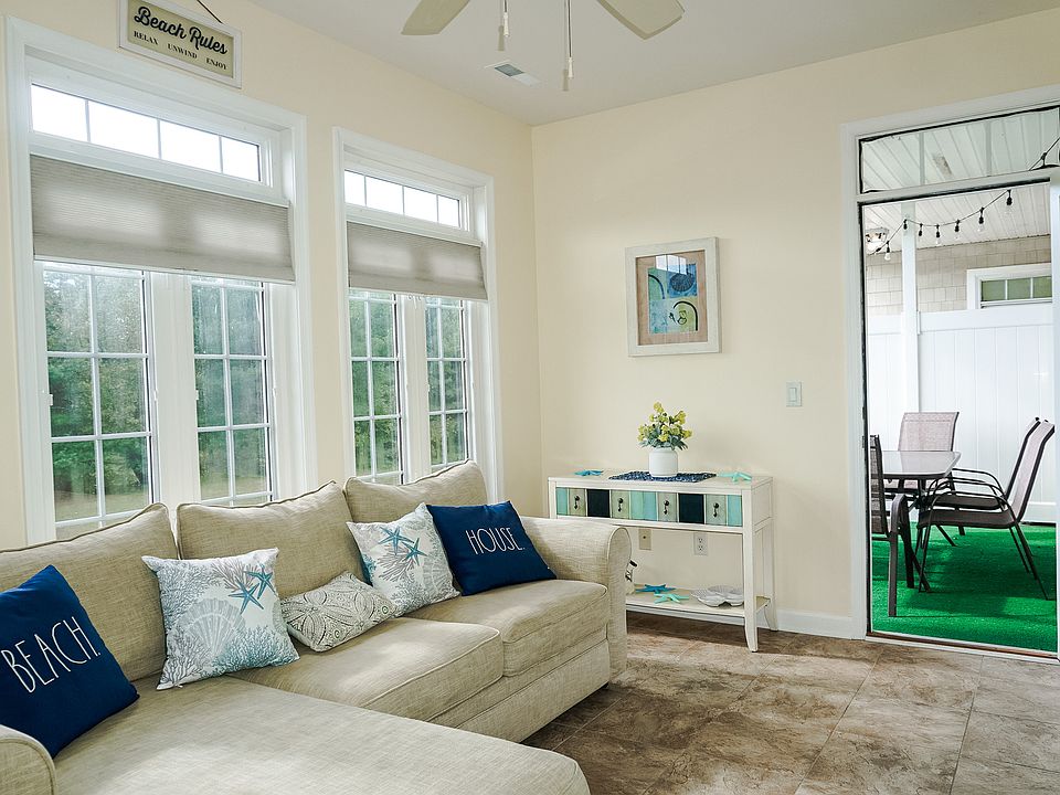 This unit offers two generously sized guest bedrooms and a full bath. The open-concept layout seamlessly connects the kitchen, dining area, and living room perfect for entertaining or relaxing after a day exploring Delaware's beach towns. The primary suite features a spacious bedroom and bathroom, along with direct access to an open-air porch through sliding glass doors. Off the living room, enjoy a bright and inviting sunroom that fills with afternoon light, with French doors that also lead to the porch.