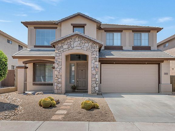 This stunning home is located in the heart of Anthem, a beautiful award winning master planned community where joy abounds. At first sight you will notice a welcoming front porch, decorative stonework, and a lovely neutral color palette. The dramatic front entrance is enhanced by vaulted ceilings, custom pillars, and charming loft. The kitchen boasts ample storage and stainless appliances. The primary suite is located on the first floor as well as a secondary bedroom and a full guest bathroom. The second story has all the space one could need with four large bedrooms, two full baths, a bonus room and a loft. The backyard is an entertainer's dream with an extended flagstone patio, private pool and spa, and a gas firepit. Truly Sonoran living at its finest.