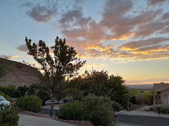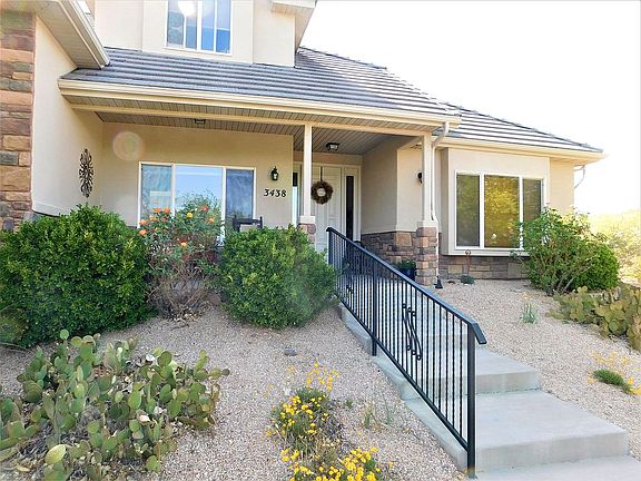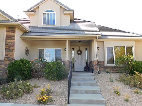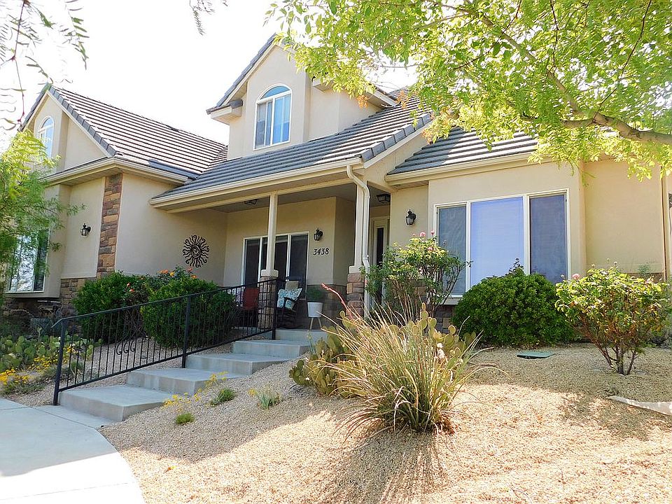 This is a rare find! Stunning views, privacy, and beauty in Bloomington. This 4 bedroom 3 bath home backs up to the Red Cliffs Desert Reserve and the famous Bear Claw Poppy Trail. Friendly neighborhood, with no HOA or CC&Rs. The home boasts a functional layout with an upstairs bonus room and many closets, including shelving in the garage! It is clean in and out with a central vacuum system, water softener, RO water filter, cleaned air ducts, and brand new water heater. New carpets and paint throughout. Outdoor sauna, chicken coop, trampoline, garden beds, and kids' playhouse included.