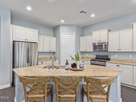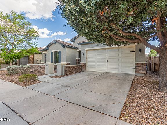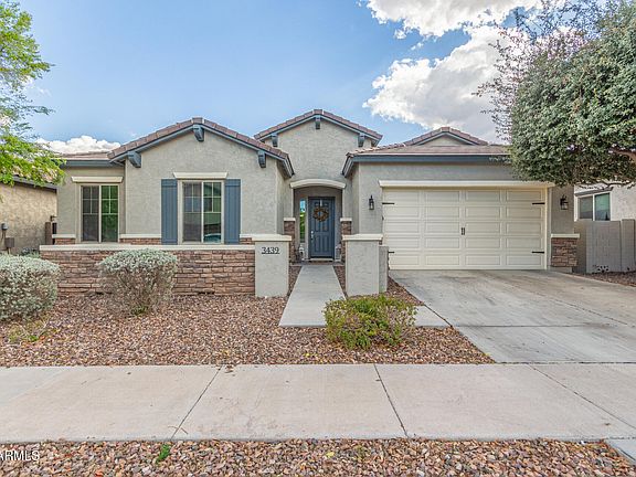 Welcome to this move-in-ready and charming Lyons Gate home! Inside you'll find warm, trendy wood-look tile throughout, neutral paint, and light, modern cabinetry. The spacious kitchen with an oversized island features abundant counter and cabinet space. An extra den/office/playroom makes for a wonderful flex space. The master bedroom is split for ultimate privacy. The low-maintenance backyard includes artificial turf and elegant travertine tile. Home also features wifi enabled permanent holiday lighting! Lyons Gate offers access to 3 heated pools, 8 playgrounds, and dozens of greenbelts. Just under 1 mile from the Agritopia Epicenter with exceptional dining and shopping, only 3 miles from San Tan Marketplace and 1 mile from the loop 202. This home is the definition of centrally located.