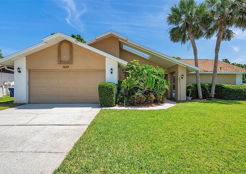 Great location, in a non-evacuation zone. The home is storm-ready, with hurricane impact sliding glass doors in the family room, living room, and master bedroom. Lightweight Kevlar fabric hurricane shutters for all windows are easy to install and remove when needed. Plus this home is convenient to everything. If you love the beach, you are only 13 miles away from the famous Clearwater Beach and only 7miles from the Honeymoon Island. If you love shopping, dinning and going to the movies, you are only 3miles away from Countryside Mall. If you love outdoor activities such as swimming, walking, biking, tennis and playgrounds, look no further than your own backyard. This 4 bedroom 3 bathroom ranch style home has a fenced in backyard that opens to neighborhood park with a quarter mile loop. The home's layout accommodates all stages of life with an ensuite on one side of the house and the master bedroom on the other. The master features not only a walk in closet but also an oversized closet and linen closet. It opens up to the serine lanai giving it nice natural light. The ensuite's bathroom has a walk in shower and its own private entrance to the pool. The 3rd bathroom features a tub and is centrally located not only between the two bedrooms but also just off the kitchen. The Kitchen opens into the family room and has a great view of the pool. The large pool can be seen throughout the home which is a great feature for a family and is a pleasant ambiance for everyone. The must have home office features French doors and a whole wall shelving unit. Storage space is conveniently located throughout the house, including garage shelving, kitchen pantry, laundry room closet and three linen closets. *New roof in 2022; all three exterior doors (front, garage side, 2nd MBR) replaced with impact doors in 2024. The whole interior freshly painted. New carpet in the 3 bedrooms.