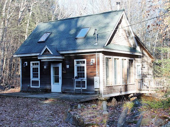 If you are looking for privacy and seclusion in a country setting come check out this 1999 4 season Cabin/Cape on 5.7 acres adjacent to a large parcel of conservation land. This home is a cozy primary residence, a vacation getaway or could be an ADU while you build a larger primary residence on the land, subject to town approval. The home features 2 bedrooms and 1 full bath including a 1st floor primary bedroom and a loft bedroom accessed by the spiral staircase and open to the vaulted Living Room area. The 1st floor bedroom contains a walk-in closet with a dryer hook-up and dryer, and the washer is located in the kitchen area. The kitchen also features butcher block counters, Maple cabinets and an extra deep kitchen sink. Wide Pine floors run throughout the home for a rustic but finished look. There are 3 heat sources including a propane heat stove, a woodstove and a couple of sections of electric baseboard as backup. The roof was replaced 12 years ago with architectural shingles when the rear addition was added, and the exterior is Cedar clapboard and shakes. There are a couple of small areas still needing Cedar shakes but the home is well insulated and protected from the weather. With a 200 amp electrical service there is plenty of power to add heat pump/AC units and a generator hook-up if desired. This unique and handsome home is completely livable year round and ready for your personal touches, come take a look and see it it is the one you have been looking for!