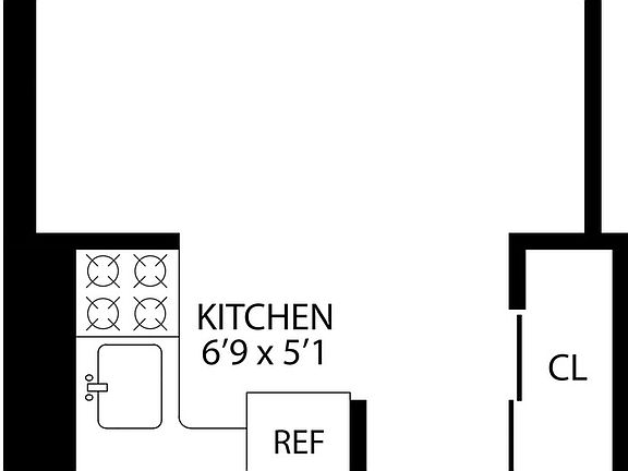 Large studio with a sleeping alcove. Full kitchen. Bathroom with bathtub.